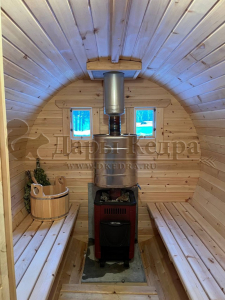 Это изделие круглой вытянутой формы с тремя отделениями: раздевалкой, моечной и парной. Во всех трех отделениях с обеих сторон установлены лавочки из кедра. Печь находится в парилке около дальней стены. Для удобства пользования в бане висят полочки из кедра и вешалка в раздевалке. Время растопки такой бани не превышает 30 минут. По вашему желанию баню-бочку можно дополнить печью с внешней загрузкой, благодаря которой весь мусор после топки останется на улице. Круглая баня-бочка не требует полноценный фундамент, поэтому при необходимости ее можно перенести в другое место.