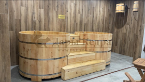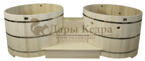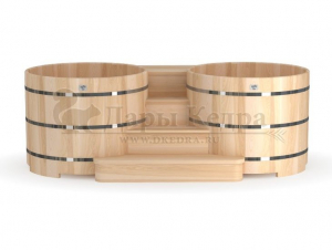 Двойная купель из кедра чаще всего используется в крупных банных комплексах и оздоровительных центрах. Она представляет собой две круглые чаши для воды, в которых люди отдыхают после парения. Между купелями установлен широкий подиум из кедра, по которому могут спускаться и подниматься сразу несколько людей. Для комфортного отдыха купель оснащена лавочками и двумя дополнительными лестницами. За счет стяжных болтов обручи из нержавеющей стали плотно прилегают к кедровой купели. Это позволяет равномерно распределять нагрузку воды и сохранить форму изделия в период эксплуатации. При правильном уходе купель для бани не рассыхается и не подвергается гниению.