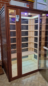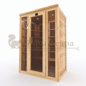 Это специально оборудованная кедровая кабина для прогрева тела человека сухим теплом. Воздух в таких парных не нагревается. Инфракрасные лучи воздействуют на тело, равномерно прогревая мышцы, суставы и органы. Карбоновые излучатели, встроенные в стены кабины, обладают мягким прогревом, что полностью исключает возможность ожога. Работает кабина за счет электричества. Двухместная инфракрасная сауна с карбоновыми излучателями подойдет как для домашнего использования, так и для коммерции.