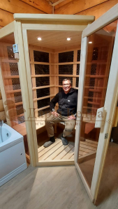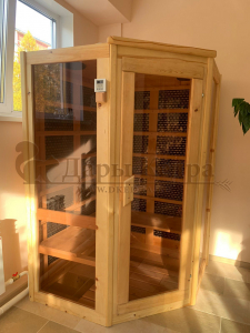 Это специально оборудованная кедровая кабина для прогрева тела человека сухим теплом. Воздух в таких парных не нагревается. Инфракрасные лучи воздействуют на тело, равномерно прогревая мышцы, суставы и органы. Карбоновые излучатели, встроенные в стены кабины, обладают мягким прогревом, что полностью исключает возможность ожога. Работает кабина за счет электричества. Установка сауны в угол, позволяет рационально использовать пространство помещения. Подходит как для домашнего использования, так и для коммерции.