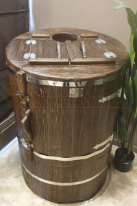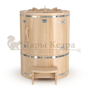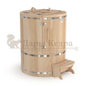 Это круглая фитобочка из кедра увеличенных размеров с толщиной стенок 45 мм. Подходит для людей высокого роста и крупной комплекции. Фитобочка оборудована откидными створками, дверцей и отверстием для головы. Во время парения человек сидит внутри кедровой бочки, а голова находится снаружи. Благодаря этому исключается возможность перегрева. Подлокотники из кедра, встроенные ручки на створках и двери делают эксплуатацию более удобной.