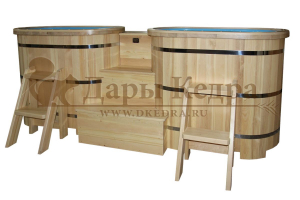 Купель представляет собой две овальные емкости для воды с пластиковыми вставками, в которых люди отдыхают после парения. Между купелями установлен широкий подиум из кедра, по которому могут спускаться и подниматься сразу несколько человек. Для комфортного отдыха купель оснащена лавочками и двумя внутренними лестницами.