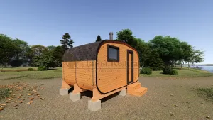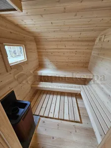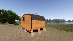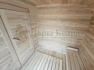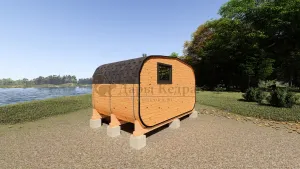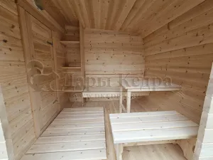 Овальная-Окта баня-бочка из кедра просторная и вместительная. Имеет два отделения: раздевалку, которую можно использовать как комнату отдыха, и парилку. Для удобства пользования раздевалка оснащена лавочкой, полкой и вешалкой из кедра. В парильном отделении располагается печь и двухуровневый открытый полок. Для установки такой модели не требуется полноценный фундамент, поэтому при необходимости ее можно перенести на другое место. Так же баню-бочку можно укомплектовать верандой со скамейками, козырьком и печью с внешней загрузкой, благодаря которой весь мусор после топки останется на улице.